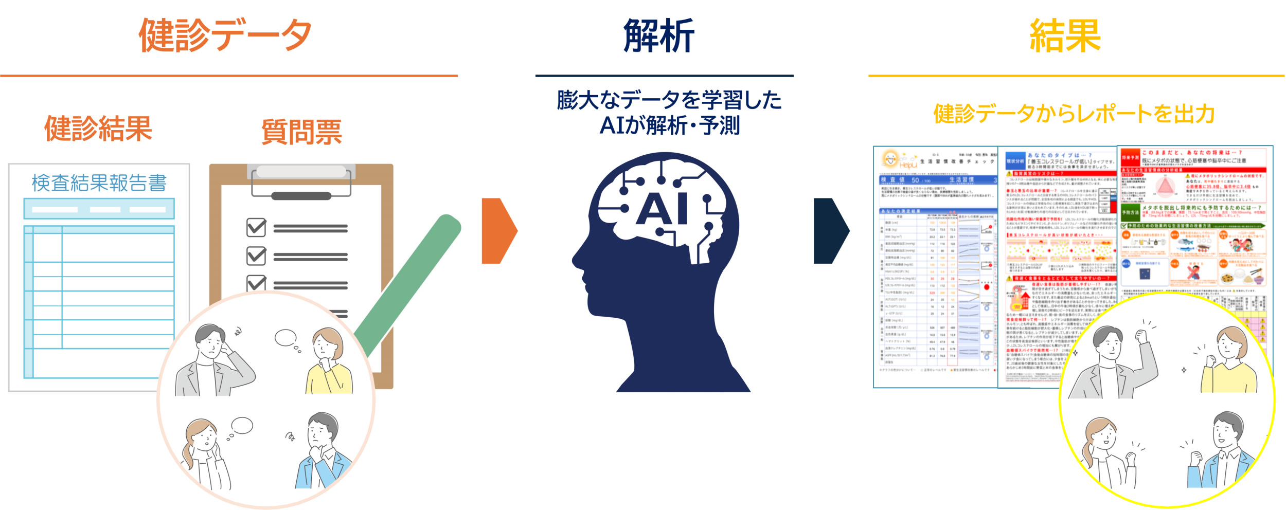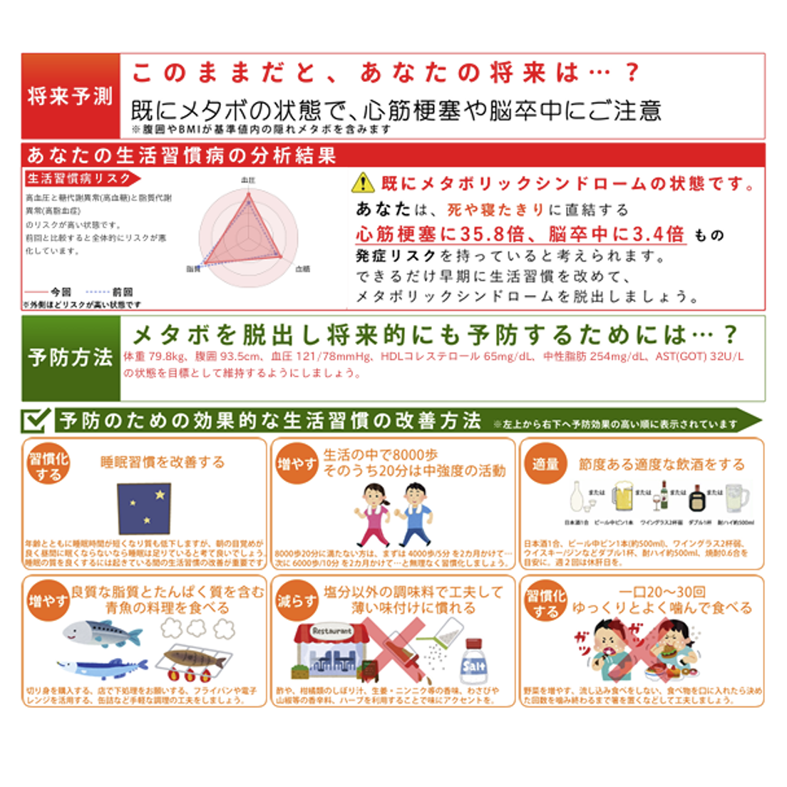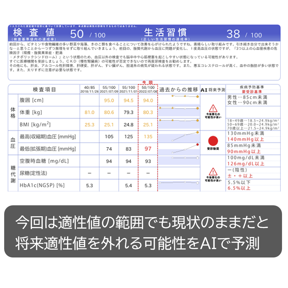 は、健診データをAIが解析し、将来の疾病リスクを予測、あなたの改善策を提案するサービスです. 最適な生活習慣や目標数値を提示し、行動変容を促進し早期の予防、改善、健康維持を支援します.