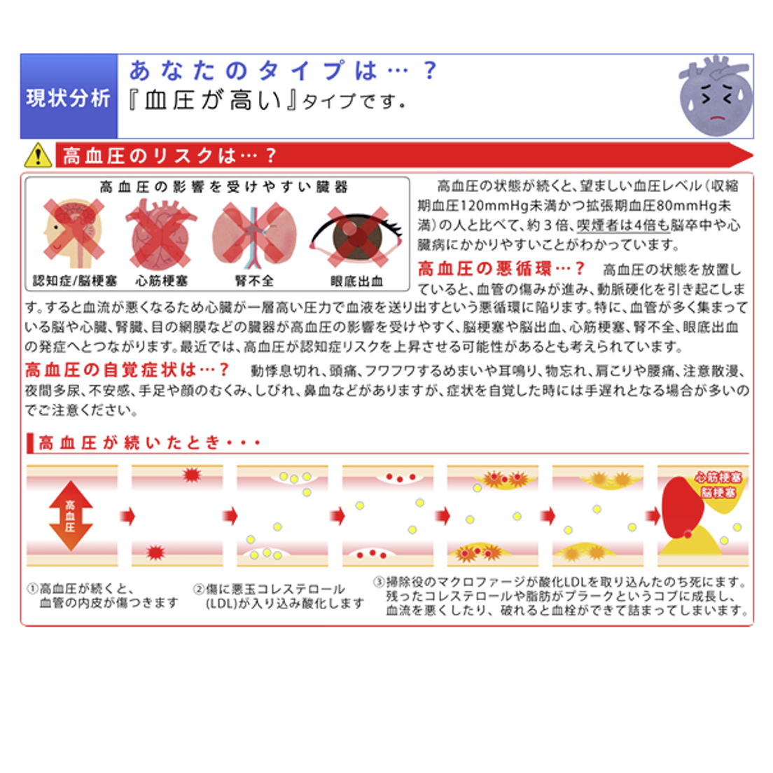 HELPUは、予測される疾病の発症メカニズムや、具体的な目標検査数値を示すことで、改善への動機づけを高めます。あなたが注意すべき生活習慣病を示してくれ、その予防のための生活習慣改善アドバイスを提案します。